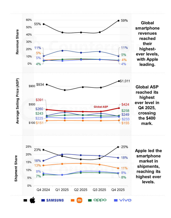 从全球格局来看,澳洲幸运5app官网下载苹果不仅市占率第一,也牢牢主导着高端市场。Counterpoint数据显示,2025年四季度,苹果以25%的全球出货量份额,占据着全球59%的全球收入份额。同期,全球手机均价达到424美元(2947元),而苹果手机均价首次增长至1011美元(约合7027元),三星、OPPO和vivo的均价均未超过260美元,小米手机的均价仅155美元(约合人民币1077元)。