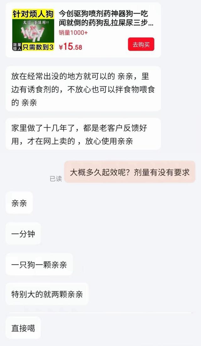 记者无意进店商榷,客服并未径直先容商品,而是依稀给出“1.遣散 2.安眠 3.透彻措置”三个数字选项,当记者恢复“3”后,客服明确暗意“一颗就起效”,但永恒拒却流露药品配方、是否对东谈主体无益等中枢信息,商品议论区也有不少与“毒狗”有关的使用评价。