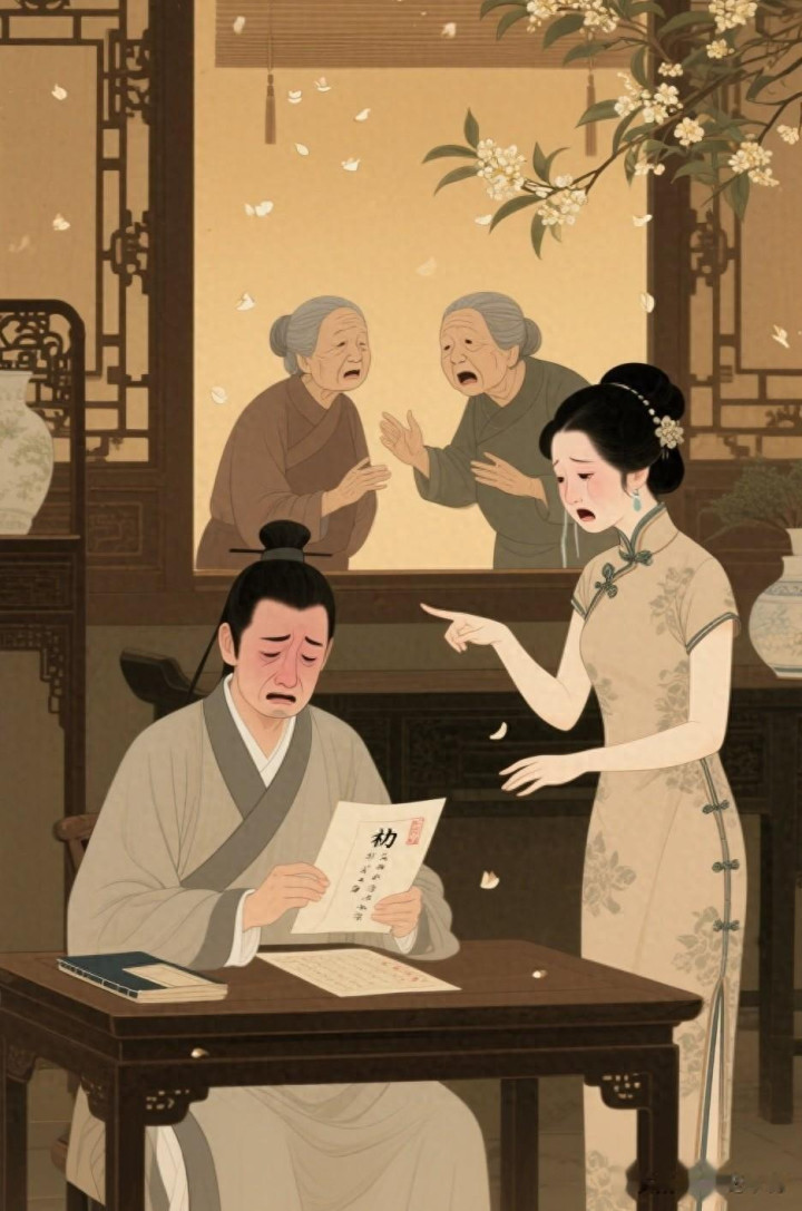 这天晌午,沈文修躲在书房里,案桌上铺着一张宣纸,上面写着“休书”二字,墨迹都快干了,可他握着狼毫笔的手,还是一个劲地抖。窗外的桂花瓣被风吹得落了一地,飘进窗棂,落在宣纸上,晕开一小片浅黄,可他连抬手拂掉的心思都没有。