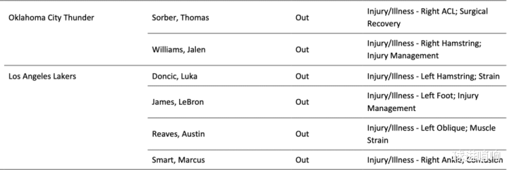 除此除外,里夫斯(左侧腹斜肌拉伤)、斯马特(右脚踝损伤)、詹姆斯(左脚伤病责罚)和海斯(左脚酸疼)均因伤缺席本场比赛。
