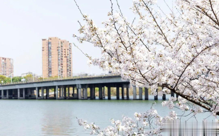 在信安湖的十里滨水长廊,沿岸赞助有河津樱、大渔樱等数十种樱花,粉白如霞,春水碧波,落英纷飞。在此溜达、骑行、亦或露营野餐,与文昌阁相映,这是城市春日最和缓的款式线。