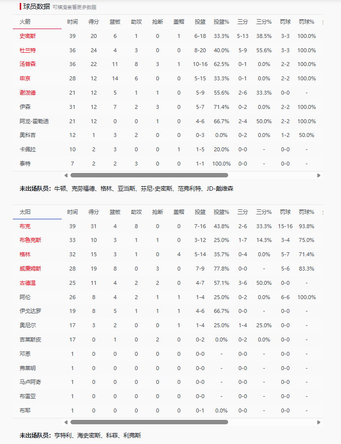 太阳数据(43-36):德文-布克31分4篮板8助攻;马克-威廉姆斯19分8篮板3抢断;杰伦-格林15分3篮板3盖帽;乔丹-古德温11分4篮板;狄龙-布鲁克斯10分3篮板