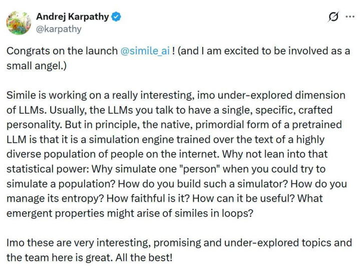 看成投资者之一的 Karpathy 暗示:Simile 正在探索一个十分意思意思、但仍被低估的 LLM 维度。陆续咱们与之对话的大模子,澳洲幸运5app下载往往被赋予一个单一、全心设定的东说念主格。但从旨趣上看,一个预磨真金不怕火 LLM 的原生模式,其实更像是一个基于互联网海量、各类化东说念主类文本磨真金不怕火而成的模拟引擎。