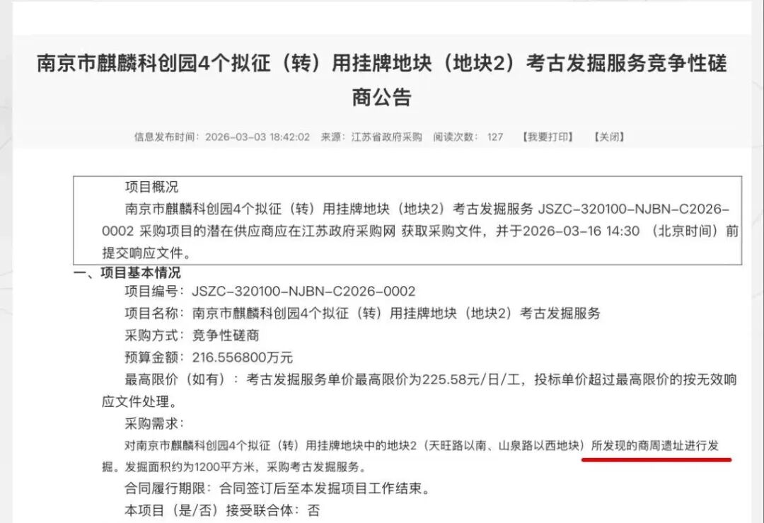 近日,江苏省政府采购网发布的《南京市麒麟科创园4个拟征(转)用挂牌地块(地块2)考古发掘业绩竞争性野心公告》暴露,在地块中发现了商周遗迹,官方研讨采购考古发掘业绩。