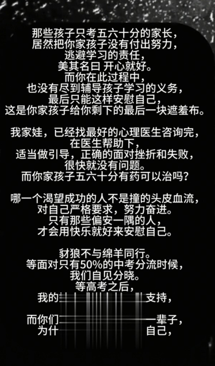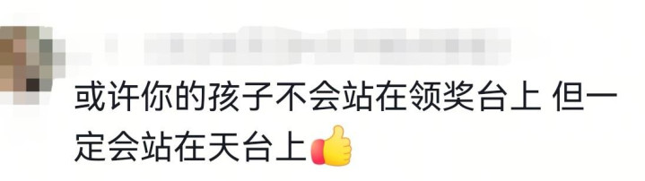 有网友又留言了,网友说他的孩子未必会站在领奖台上,也没准儿会站在天台上,毕竟给了孩子如此大的压力,谁又说得好呢?