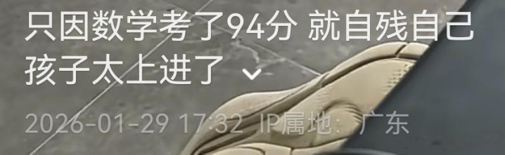 博主在视频底下配文“只因数学考了94分,就自残自己,孩子太上进了”,看样子博主认为自己女儿的行为是上进。