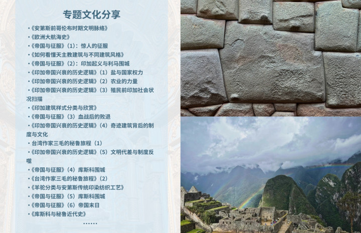 逐日2-4场专题文化共享,从考古古迹到餐厅餐桌,随时答疑,补足历史文化学问欠缺;改动收罗70%荒唐表露,马丘比丘的真实用途与最大看点?印加石墙背后的轨制与工夫……
