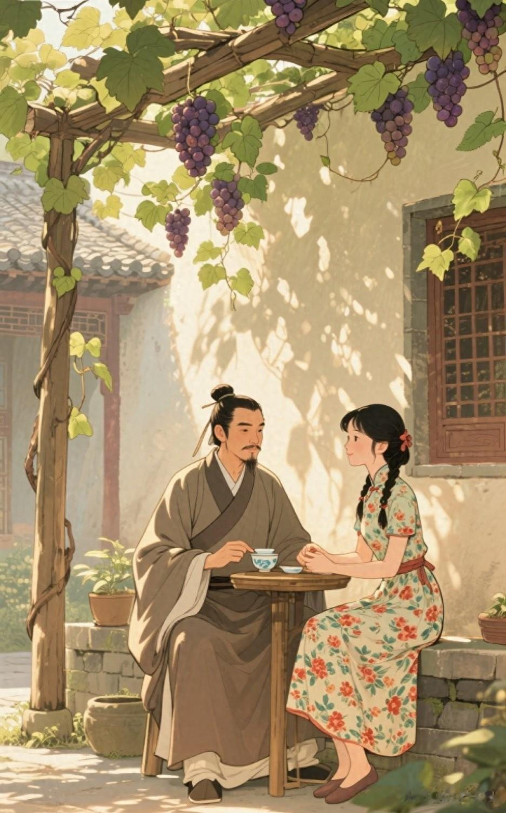 这天晌午,吃过午饭,爹坐在院子里的葡萄架下喝茶,手里还拿着一本线装书,阳光透过葡萄叶的缝隙洒在他脸上,别提多俊了。我凑过去,挨着他的椅子坐下,忍不住又把憋了好久的问题抛了出来:“爹,你跟我说说呗,你当年咋就娶了我娘呀?你看你长得这么帅,又有钱,咋就偏偏选了我娘呢?”