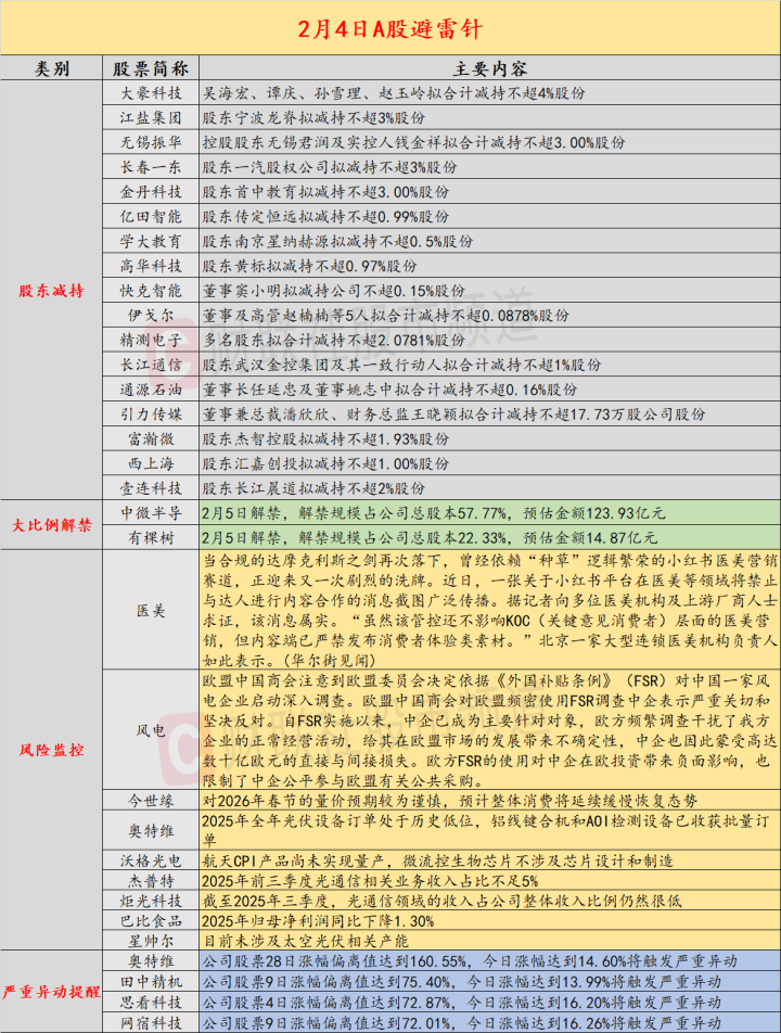 导读:财联社2月4日投资避雷针,近日,A股及海外市场潜在风险事件如下。国内经济信息方面包括:1)小红书平台在医美等领域将禁止与达人进行内容合作;2)银行理财公司今年开门红未兑现,部分头部公司规模下滑;公司方面重点关注包括:1)今世缘表示,预计整体消费将延续去年四季度以来的缓慢恢复态势,对可能成为“史上最冷春节”有心理预期;2)奥特维称2025年全年光伏设备订单处于历史低位,铝线键合机和AOI检测设备已收获批量订单;海外市场重点关注包括:1)美股三大指数集体收跌,热门科技股普跌;2)印尼矿商暂停现货煤炭出口。