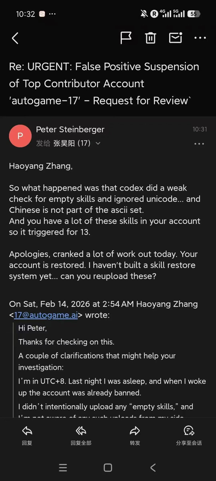 华文设备者更是东说念主心惶惑,因为就在不久前,ClawHub刚刚发生了整个误差的集体封禁事件——大量华文设备者的账号被封,原因只是是因为华文在ASCII编码中炫耀为乱码,系统把统统华文设备者上传的Skill认定为”空Skill”。触及到的账号被封号,统统之前传过的Skill被删除,而且有知名包在作家被封号后被抢注。