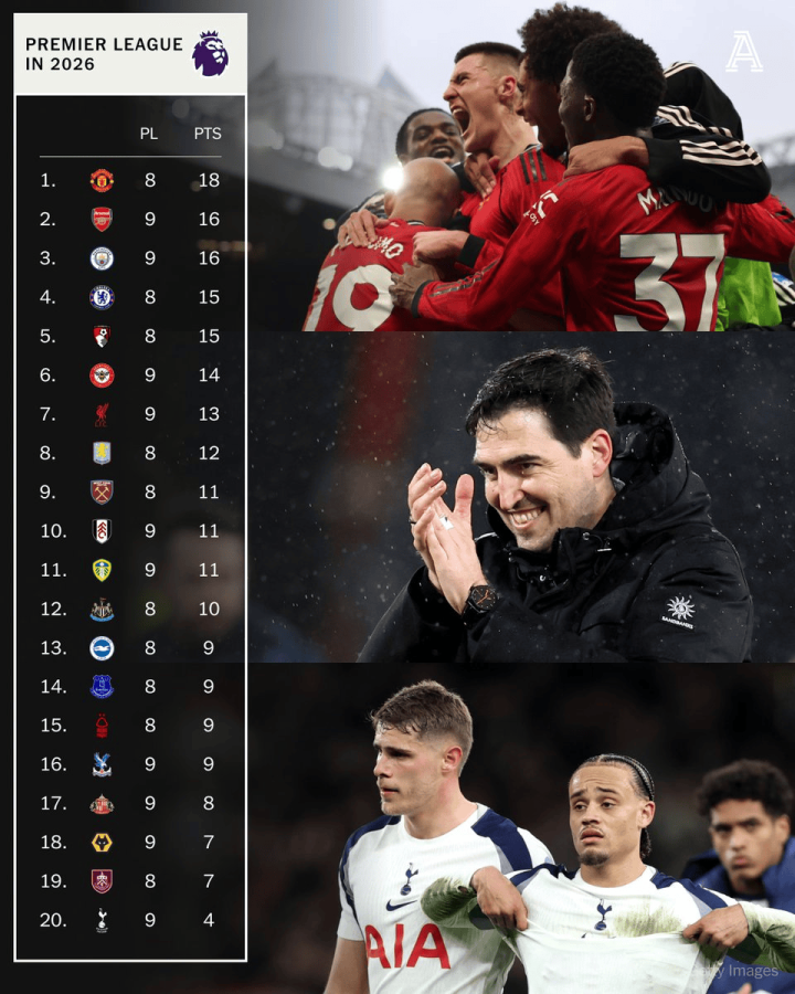 幸运5 2026年英超积分榜: 曼联不败18分居首, 热刺不堪4分垫底