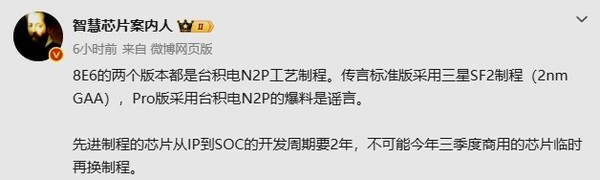 近日,数码博主“智慧芯片案内人”发文指出,上述关于制程分化的消息是谣言。他透露,第六代骁龙8至尊版的两个版本(标准版与Pro版)均将采用台积电的N2P(2nm)工艺制程。该博主从芯片研发周期的角度进行了解释,强调先进制程芯片从IP到SoC的完整开发通常需要约两年时间,因此不可能为计划在今年第三季度商用的芯片临时更换制造工艺。