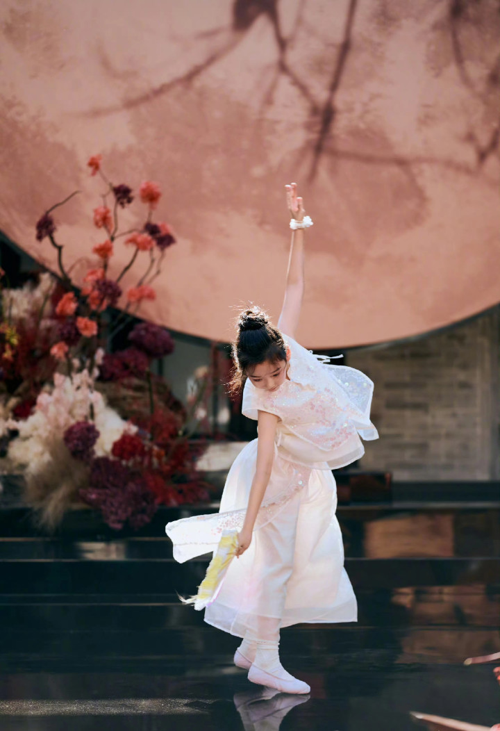 而在 "盛世华裳・国风大典" 上,她的进展更是让东说念主目前一亮。那天的她身着 "盛唐牡丹" 投降,以正红色真丝缎为底,通体绣有上百朵风景相反的牡丹花。裙摆长达三米,行走间如云霞流动,又似花海翻涌,将 "只须牡丹真国色,花开时节动京城" 的诗意具象化为视觉奇不雅。她还演绎了一段和会唐代宫廷舞与当代编舞语汇的独舞,九牛二虎之力间,既有古典的婉约,又有当代的符号。