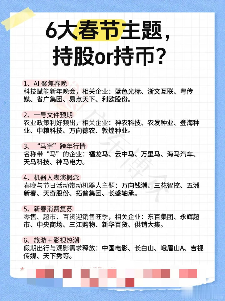 最后想问问各位投资者:今年春节你最看好哪条主题赛道?是打算持股过节,还是持币观望?欢迎在评论区留下你的观点,一起交流探讨。祝大家在马年投资顺利,收益长虹!