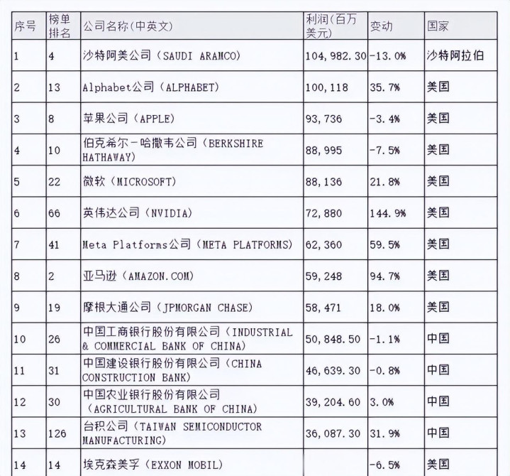 看这个榜单,好意思国企业利润总数6234亿好意思元,占宇宙500强利润的20%,主若是科技和金融驱动。像英伟达728亿好意思元,靠AI芯片火了,微软881亿好意思元,亚马逊位列第八。
