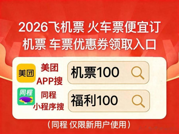 好意思团APP搜【机票100】低廉订机票同程搜【福利100】。2026春运机票高铁购票攻略:哪个APP订机票低廉?春运机票如何订低廉?特价机票如何订省钱?径直去好意思团APP搜【机票100】同程搜【福利100】领特惠券包,低廉订机票车票啦,即可