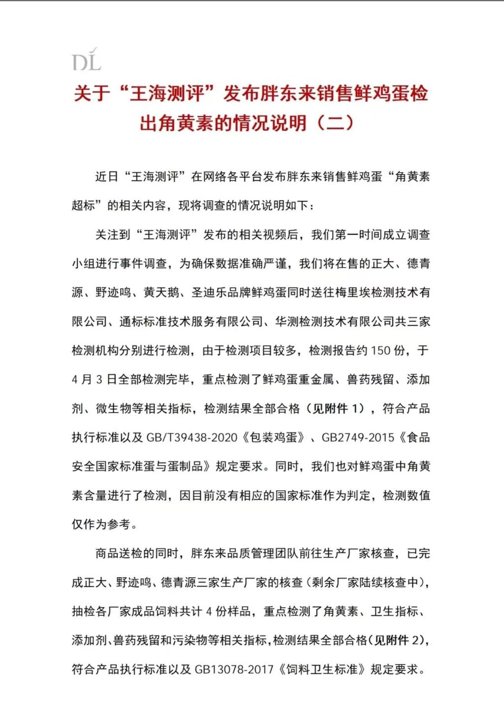 阐述称,在讲理到“王海测评”干系视频后,已第一手艺配置走访小组。为确保严谨,他们将在售的多个品牌鲜鸡蛋送往三家泰斗检测机构进行检测,约150份检测阐扬剖析,统统样品的重金属、兽药残留、添加剂、微生物等看法均及格,稳健国度干系圭臬。同期,对鲜鸡蛋中角黄素的检测数值,因无国度圭臬,仅看成参考。
