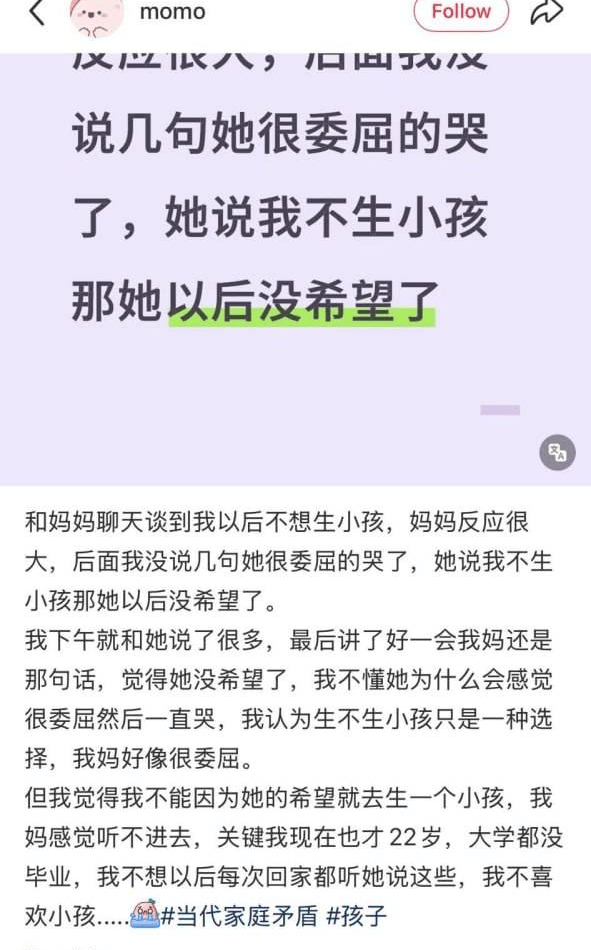 22岁女生说我方不念念生孩子,姆妈就地崩溃哭了,说“你不生小孩,我以后就没但愿了”。这件事能上热搜,不是因为儿子回击,也不是因为姆妈矫强,是因为它戳中了许多中国度庭最遮蔽的真相:咱们的亲子相关,许多手艺王人被“传宗接代”和“养儿防老”的不雅念绑死了。